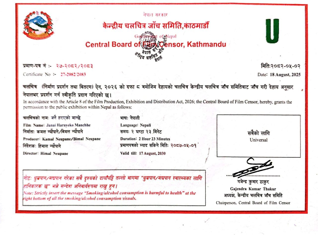 यस्तै, ‘जनै हराएको मान्छे : सम्बन्धका धागाहरू’लाई सेन्सर बोर्डबाट ‘यू सर्टिफिकेट’ मिलेको छ । सेन्सर बोर्डले सबै वर्गका दर्शकले हेर्न मिल्ने गरि युनिभर्सल सर्टिफिकेट दिएको हो ।