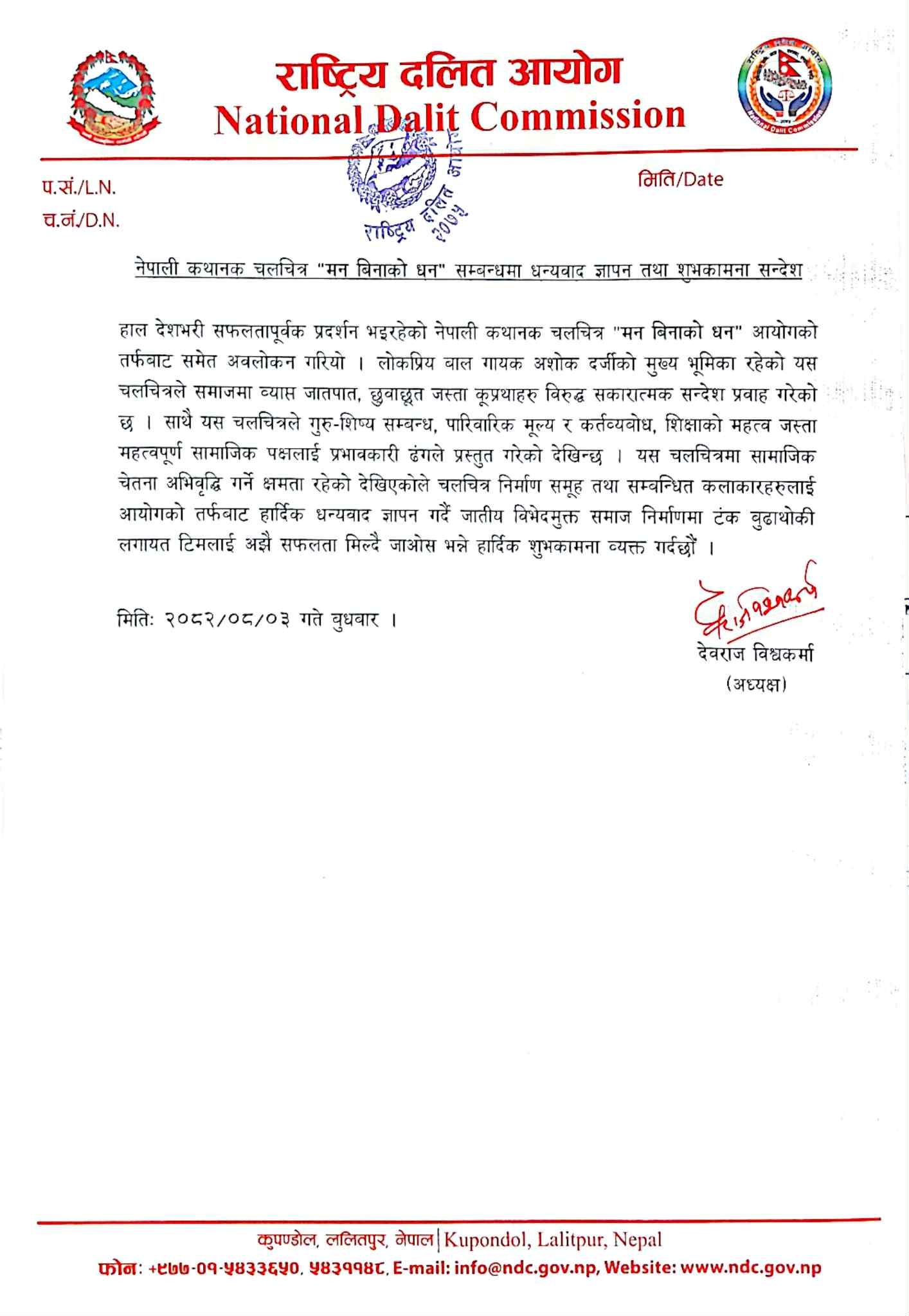 भोलिबाट देशभरिका सिनेमा घरमा तेस्रो सातामा प्रदर्शन हुन लागेको चलचित्र मन बिनाको धनलाई राष्ट्रिय दलित आयोगले शुभकामना व्यक्त गरेको छ। राष्ट्रिय दलित आयोगका अध्यक्ष देवराज विश्वकर्माले बुधबार एक वक्तव्य जारीगरि चलचित्र मन बिनाको धनलाई धन्यवाद ज्ञापन गर्दै शुभकामना व्यक्त गर्नुभएको हो।