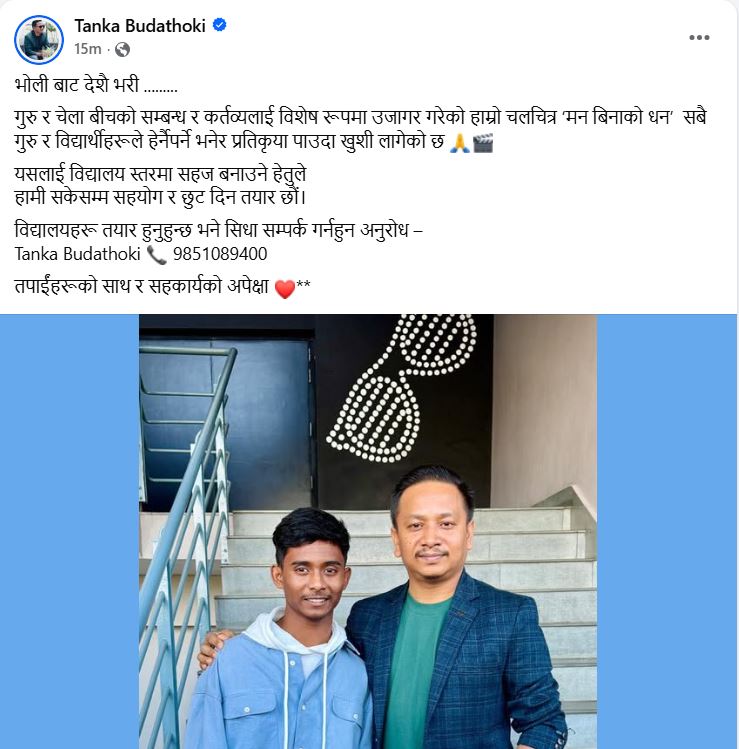 बुढाथोकीले भोलिबाट चलचित्र ‘मन बिनको धन’ हेर्ने देशैभरिका विद्यालयलाई सकेसम्म सहयॊग र छुट दिन निर्माण टिम तयार रहेको जानकारी दिएका छन् ।चलचित्र हेर्ने विद्यालयहरूलाई आफु सहयोग गर्न तयार भएको भन्दै आफुलाई सिधै सम्पर्क गर्न आफ्नो फोन नम्बर समेत दिएका छन् ।चलचित्र मन बिनाको धनले गुरु शिष्य सम्बन्ध, पारिवारिक मूल्य र कर्तव्य बोध शिक्षाको महत्व जस्ता महत्वपूर्ण सामाजिक पक्षलाई प्रभावकारी ढंगले प्रस्तुत गरेको छ