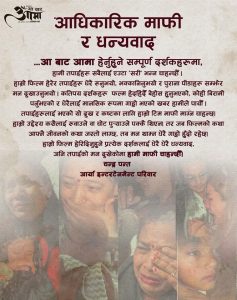 साथै, चलचित्र हेरेर भावनामा डुबेका प्रत्येक दर्शकप्रति कृतज्ञता व्यक्त गर्दै निर्देशक पन्त र निर्माण पक्षले दर्शकको आँसु नै चलचित्रको सबैभन्दा ठूलो सम्मान भएको बताएका छन्।