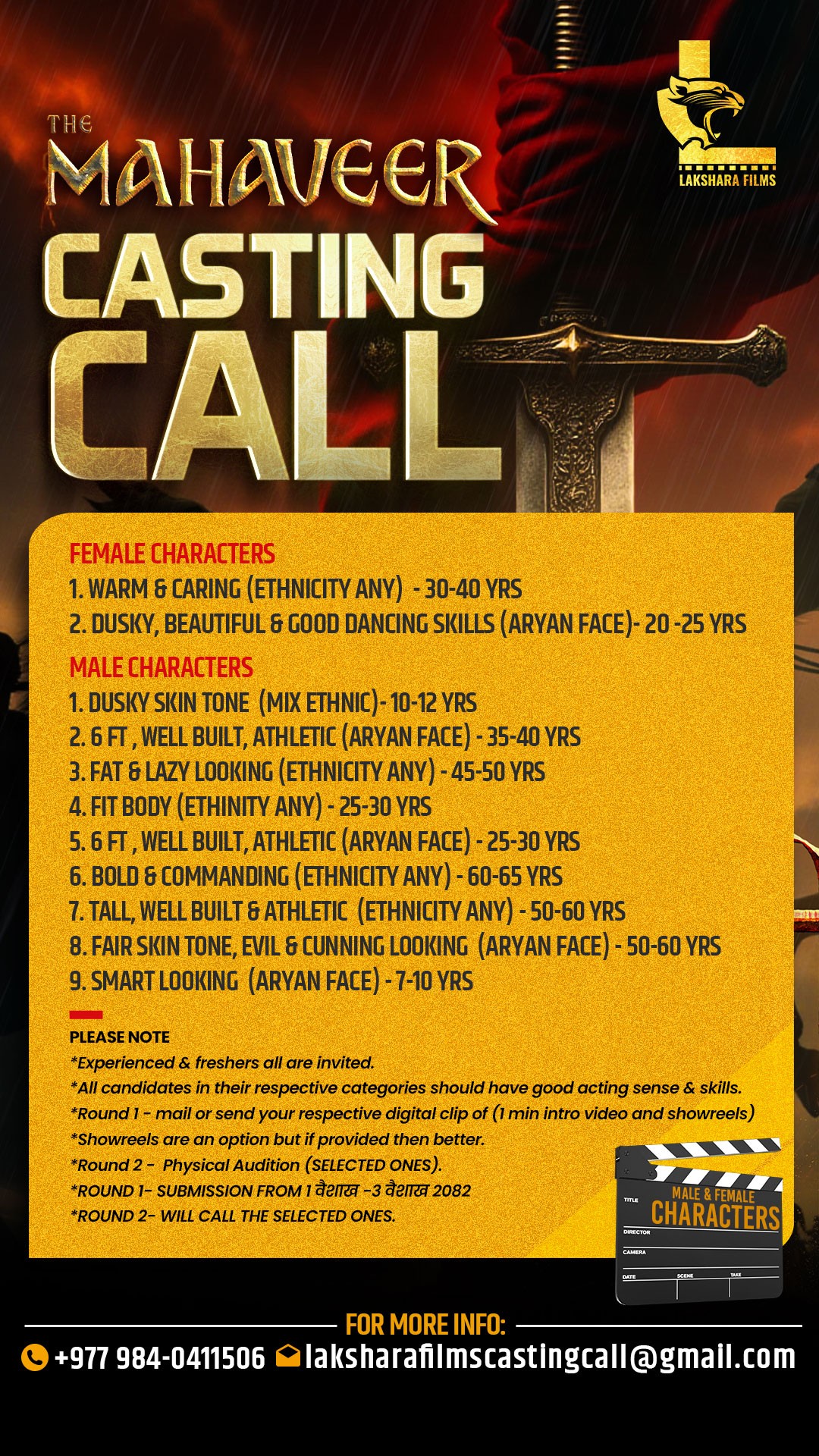 हल्का कालो छाला भएको मिक्स जनजाति फेस देखिने १० देखि १२ वर्ष उमेरको पुरुष कलाकार, ६ फिट अग्लो आर्य फेस भएको ३५ देखि ४० वर्षको पुरुष (एथलेटिक्स)का लागि पनि माग गरिएको छ ।