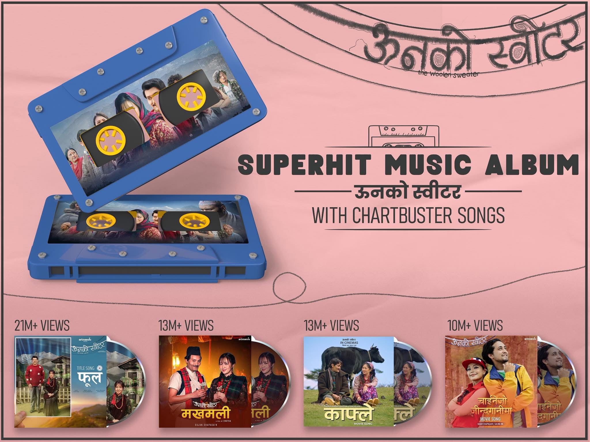 साङ्गीतिक पक्षले पाएको यो अभूतपूर्व सफलतासँगै ‘ऊनको स्वीटर’को म्युजिक एल्बम नै सुपरहिट साबित भएको छ । हालै ‘चाइनेजो जिन्दगानीमा’ बोलको गीतले पनि १ करोड भ्यूज कटाएसँगै यो गौरवपूर्ण माइलस्टोन हासिल भएको हो । यो समाचार तयार पार्दासम्म ‘फूलहरू मुस्काउँछन्’ २ करोड १० लाख (२१ मिलियन) भ्यूज, ‘मखमली’ १ करोड ३० लाख (१३ मिलियन) भ्यूज, ‘काफ्ले’ १ करोड ३० लाख (१३ मिलियन) भ्यूज र ‘चाइनेजो जिन्दगानीमा’ले १ करोड (१० मिलियन) भ्यूज प्राप्त गरेका छन् ।