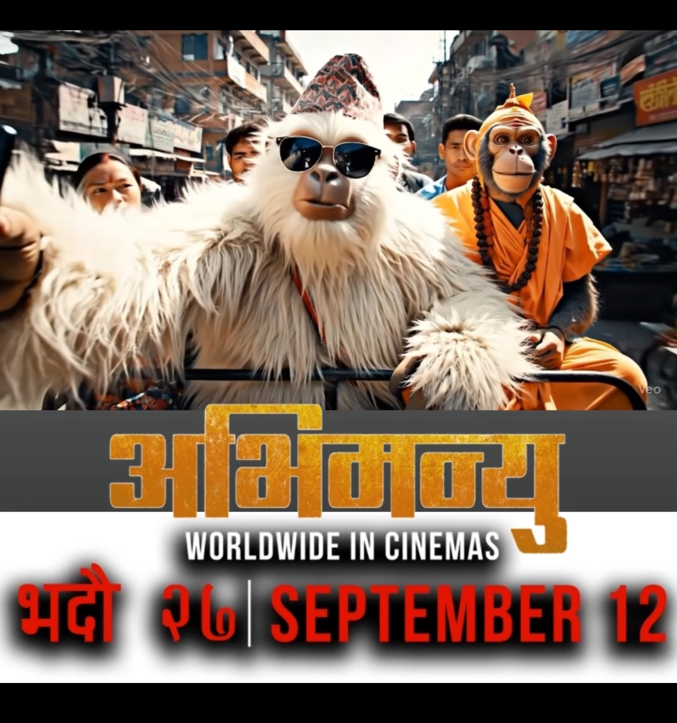 रहस्यमयी हिममानव यति सिनेमा हलको बक्सअफिसमा पुगेर चलचित्र ‘अभिमन्यु’ कहिले लाग्छ भनेर सोधेको दृश्य, जसमा हिमाली क्षेत्रमा सिनेमा हल छैन । त्यसैले चलचित्र हेर्न सहर बजार नै आउनुपर्छ भन्ने आसयको अभिव्यक्ति सहितको एआई भिडियो छ ।
